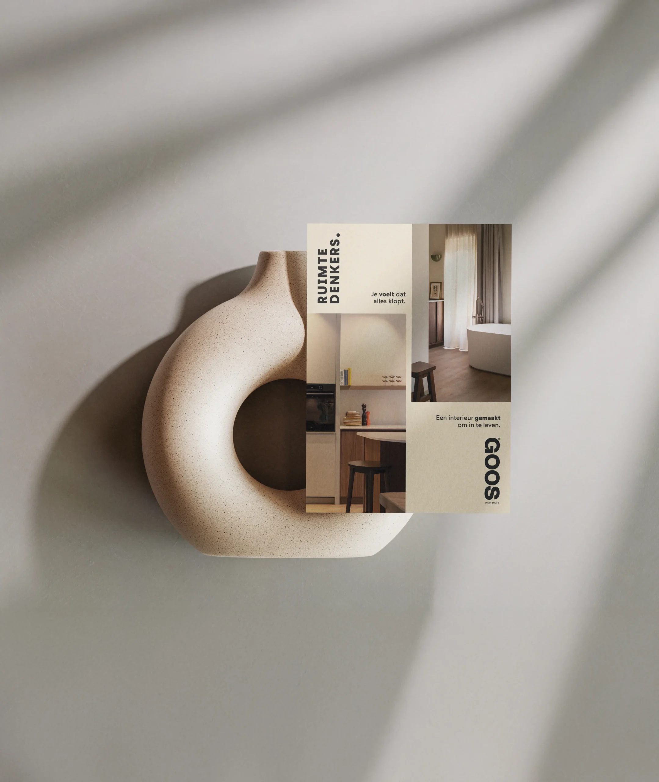 A collaborative flyer for Goos Interieurs x Ruimtedenkers. The design focuses on a symmetrical distribution of visual weight, ensuring a seamless blend of both brands.